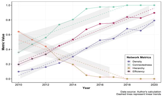 Trends in overall network structure characteristics in the Yangtze River Delta (Multi-indicator line graph, 2010–2020).