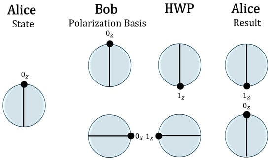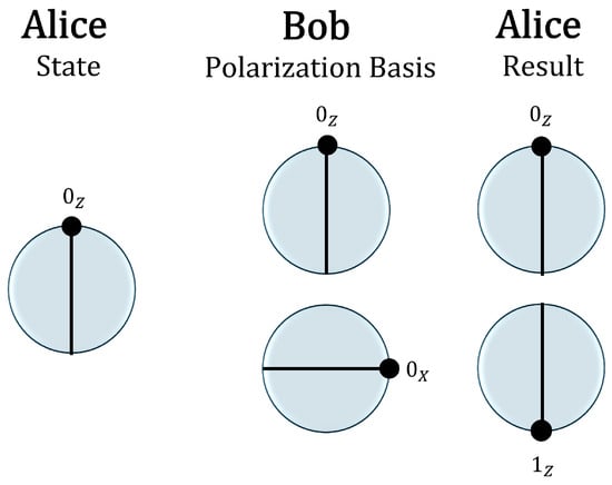 - Parameter Agreement. Alice and Bob agree on two mutually unbiased polarization bases, and , which are associated with logical bits 0 and 1, respectively. They also synchronize timing, detector thresholds, and any classical authentication mechanisms.