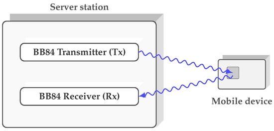 Conceptual diagram of the loop-back architecture. The BB84 transmitter (Tx) and receiver (Rx) are integrated into a single server station. A mobile device, modeled as a compact token, participates in a quantum loop-back process: a quantum pulse emitted by the Tx is directed towards the device, interacts at the mobile interface, and is then returned to the Rx, enabling the system either to establish a key with the server or to provide an authentication code.