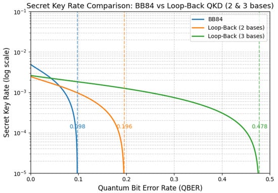 Hence, the two-basis Loop-Back protocol doubles the tolerable physical QBER compared to the standard BB84 threshold (), as a result of bidirectional propagation and orthogonality-based filtering.