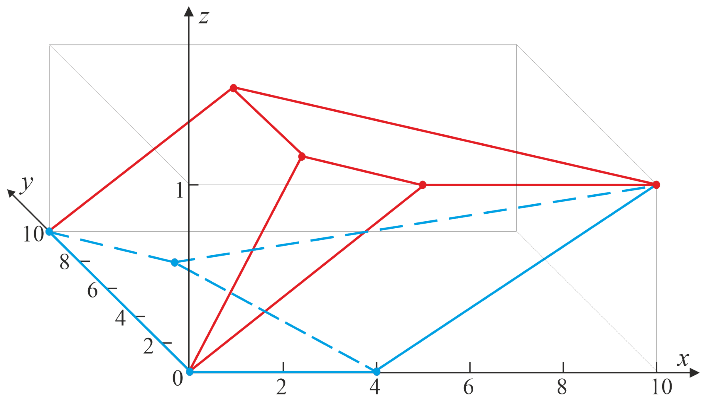 Remark 3. If the ’s are not only k-independent but also non-negative, exchangeable and have no ties, then (13) provides sharp bounds for the joint reliability function of any pair of semi-coherent systems based on common components. Specifically,where is a probability matrix of order n depending solely on the system structure, known as the structure signature of the system (cf. [29]). To see this, observe thatwhere , andSharp bounds on the lifetime distributions and expectations of a single system with arbitrarily dependent exchangeable component lifetimes were derived in [30]. Remark 4. Theorems 1 and 2 reduce the problem of determining distribution bounds for order statistics from dependent observations to finding the convex hull of a finite set of points in , where . Computing the convex hull is a fundamental step in many practical problems, including statistical tasks such as robust estimation, isotonic regression, and clustering (see [31]). Even in moderate dimensions, such as 10 or 20, convex hull computation can be challenging. Knowledge of specific properties of the convex hull in a given problem, for example, the presence of symmetry, can be helpful (see [32]). A comprehensive overview of algorithms and methods for determining the convex hull of a finite set of points in is provided in [33], along with a detailed discussion of their respective advantages, disadvantages, and recommended applications.