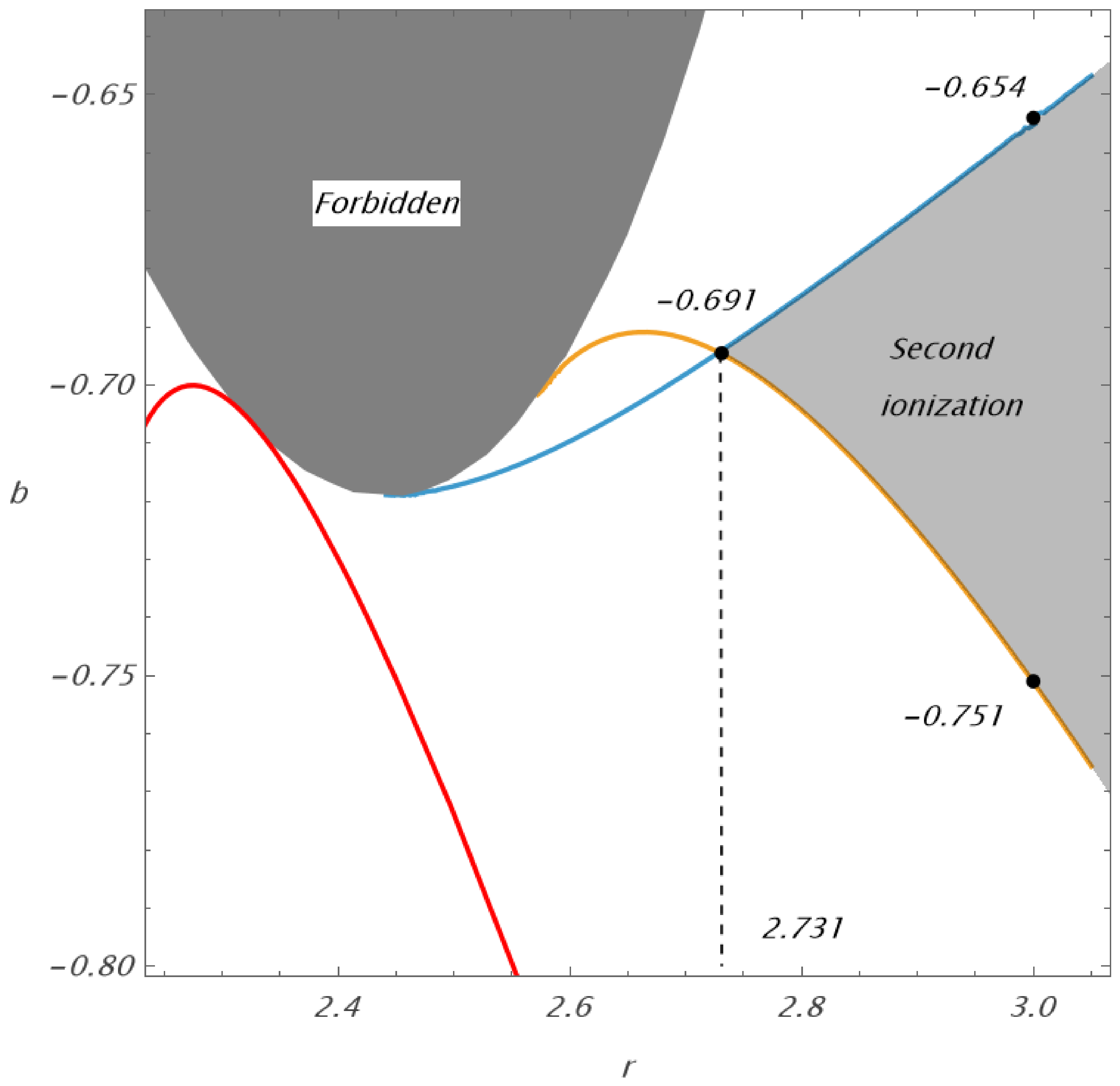 In order to demonstrate the interplay of gravity and magnetism in extremely strong regimes in close proximity to the gravitational radius, i.e., near the photon’s circular geodesic, we consider the case of secondary ionized equatorial disks. We initially assume an equatorial disk formed by charged matter under magnetic repulsion, with a magnetic parameter allowing for the existence of stable circular orbits located under . For simplicity, and in order to ensure a minimal , we choose the critical magnetic parameter . We assume that this is related to Fe ions with the first level of ionization (a Fe atom without one electron). We can thus consider secondary ionization, which results in an ionized state at the level . The magnetic parameter can thus be modified to the value of . The relations of the ionization process can be correspondingly modified, and the calculations can be realized in the same way as for equatorial Keplerian disks, with the appropriate modification of the magnetic parameter .