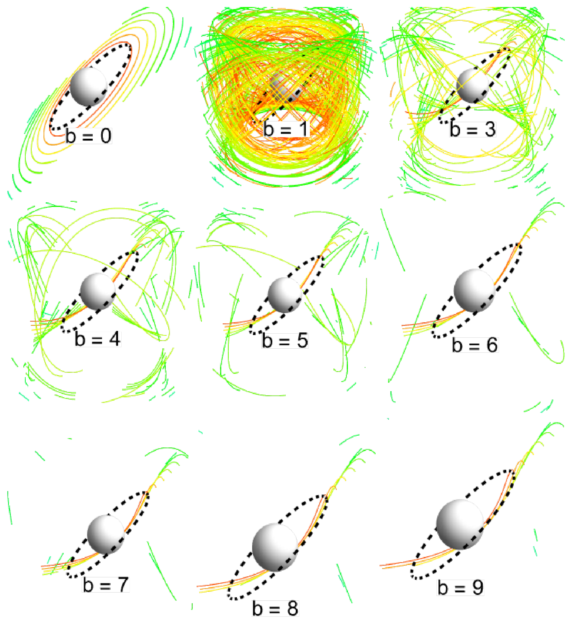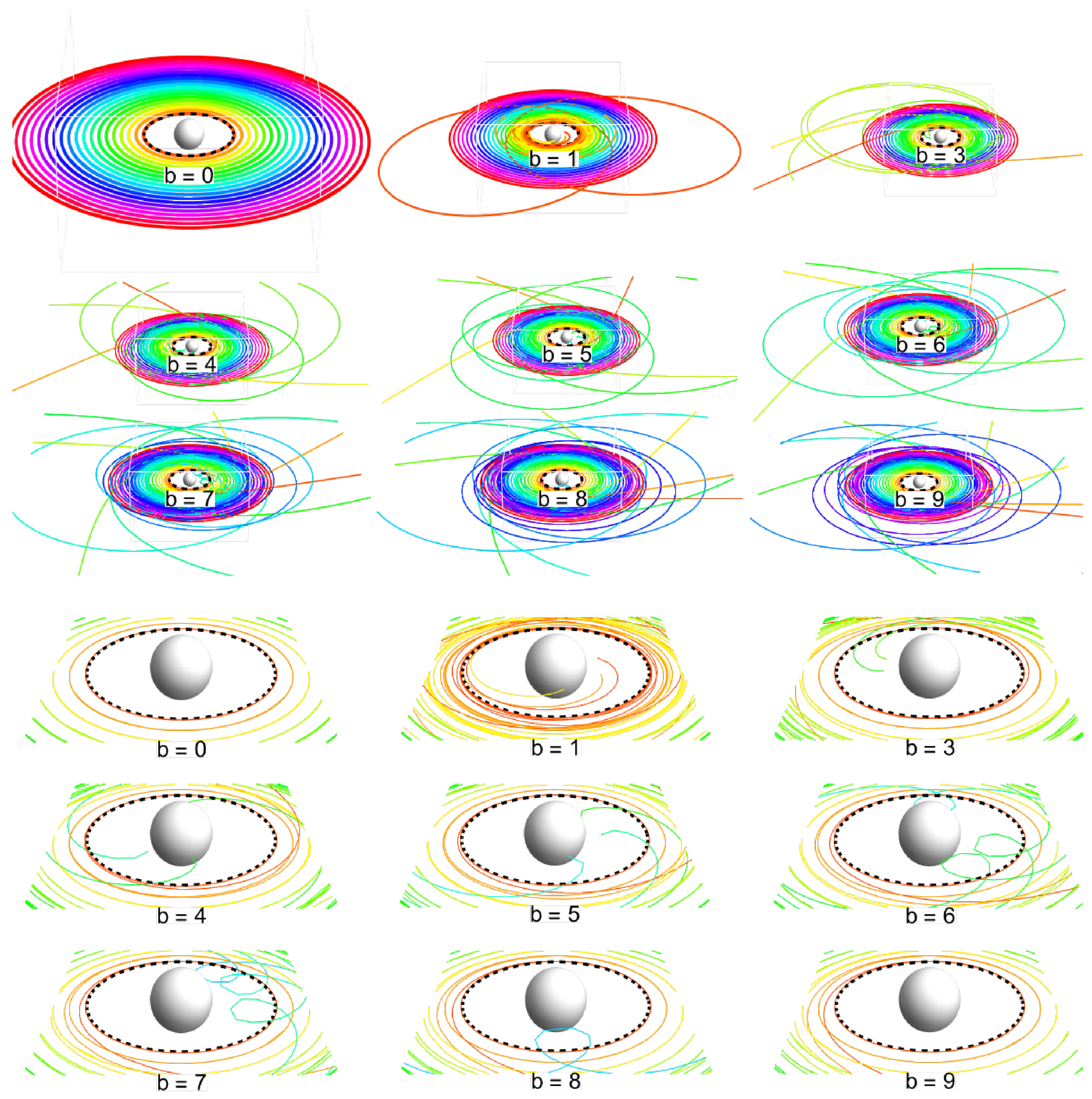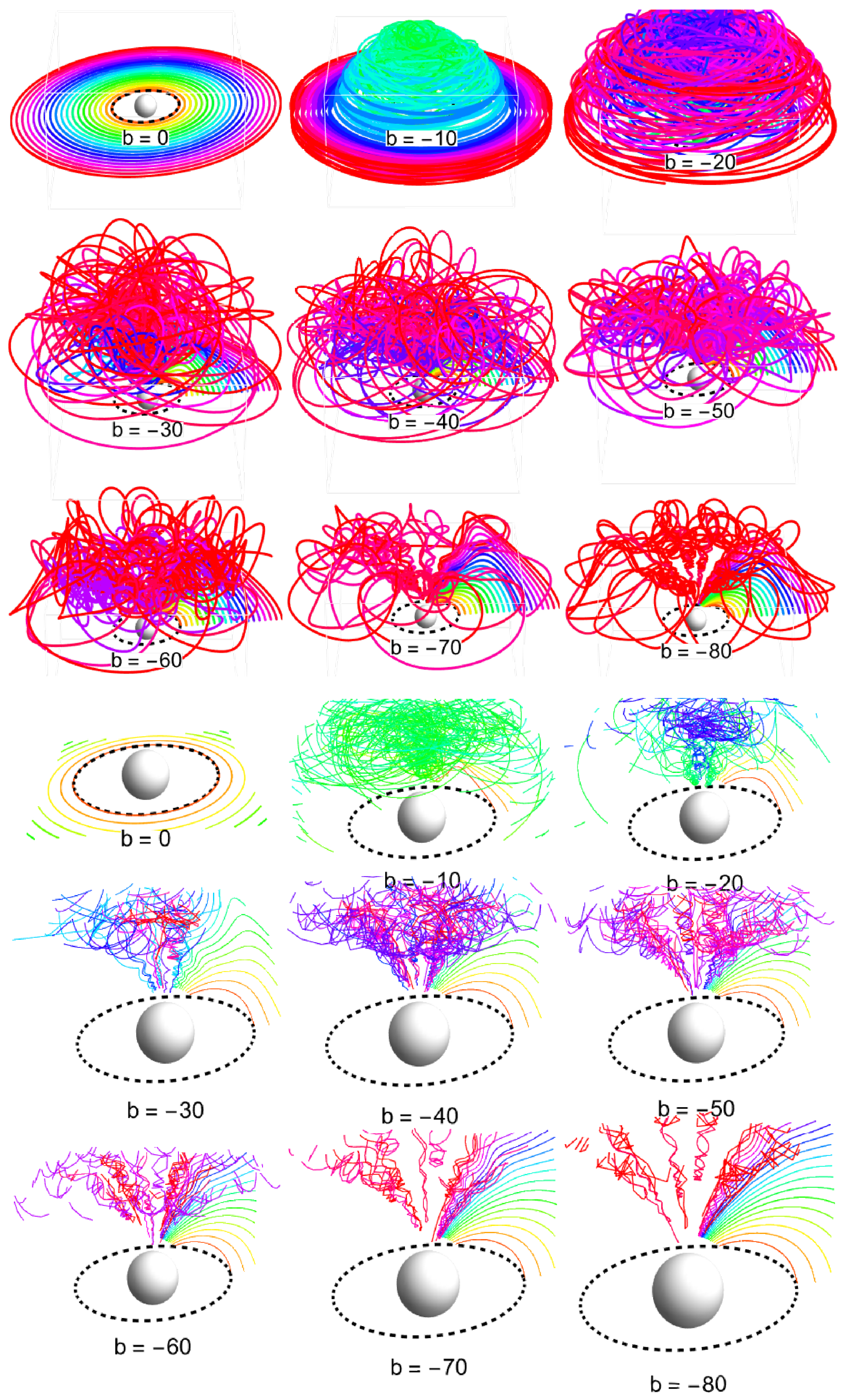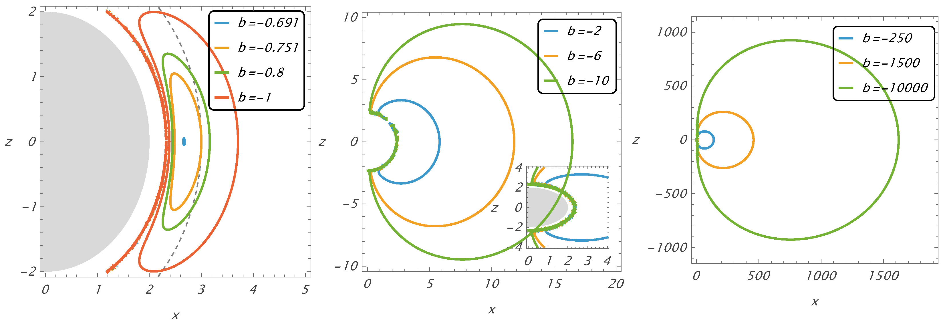The sequence of large magnitudes of b demonstrates a dramatic change. Starting from , the innermost part of the Keplerian disk is fully under the magnetic regime, efficiently repelling the particles from this part of the Keplerian disk at large distances along regular trajectories. At larger distances, the ionized disk again resembles a “hill”. With increasing magnitudes of b, the region of particles repelled along regular trajectories increases, and the chaotic nature of the interior of the “hill-like” structures also increases—the inner parts of these structures exhibit the first indications of the chaotic motion centered around circular off-equatorial orbits. In the case of , almost the entire inner part of the ionized disk is repelled. With further increases in the magnitude of b, the repelled part increases and the chaotic “hill-like” structures are shifted to larger distances from the center.