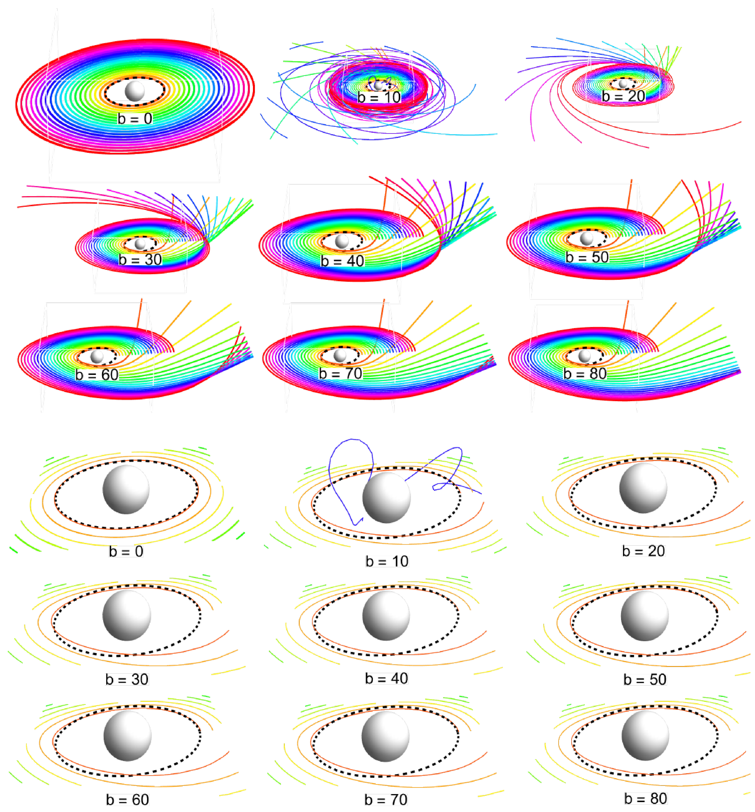 Figure 4, we demonstrate the fates of the ionized disks for both Lorentz repulsion and attraction and for both slightly inclined and highly inclined Keplerian disks.