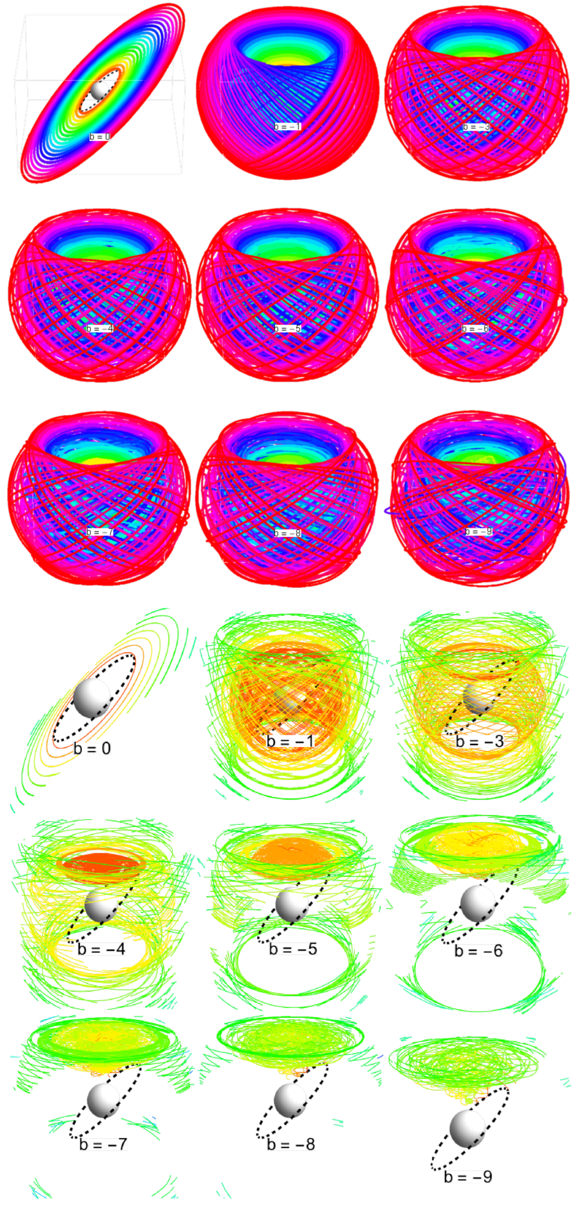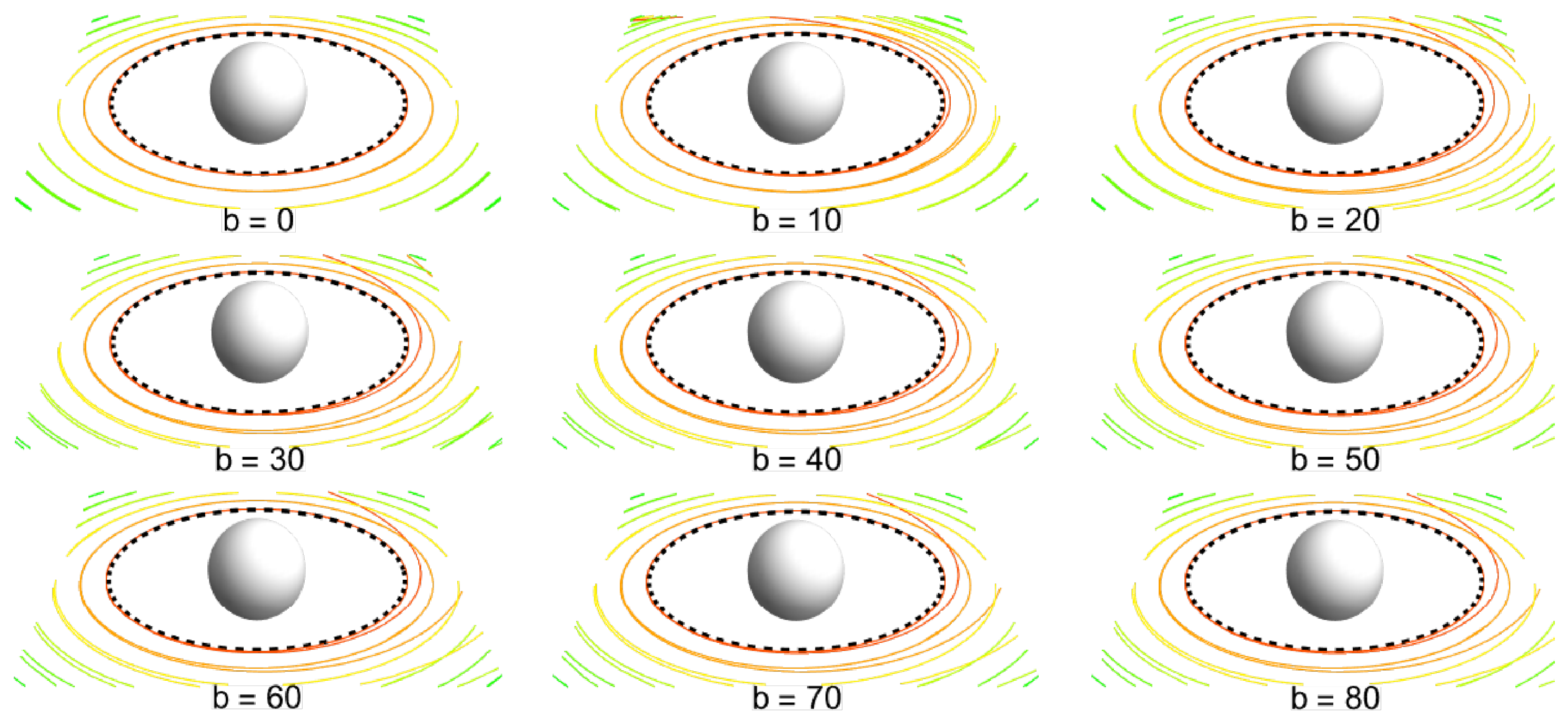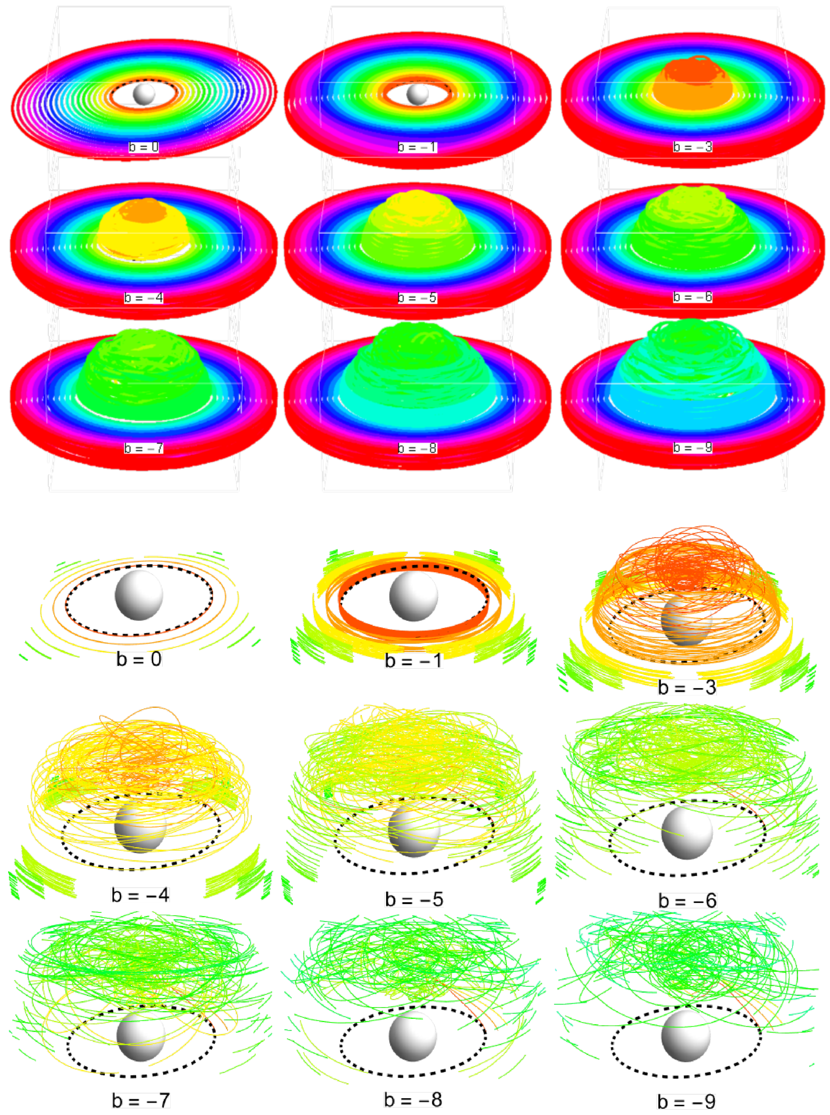 For highly inclined Keplerian disks, the behavior of the disk strongly depends on the magnitude of the parameter b. For the smallest magnetic parameter under consideration, , the ionized disk demonstrates a shift to a structure resembling a sphere created by cocentric shells, indicating motion in a gravitational regime. These shells are cut at the top of the sphere orthogonally to the magnetic field axis. These cuts represent the range of epicyclic oscillatory motion of particles starting at a radius . The shells arise across the whole Keplerian disk.