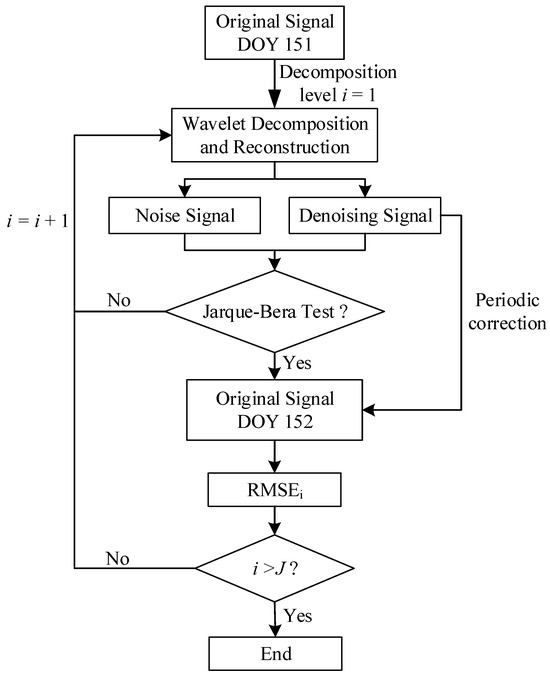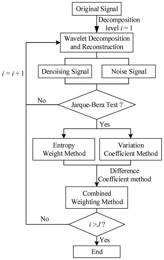 Figure 4. The original noisy signal is decomposed into noise and denoised components using a wavelet thresholding function. First, in the noise signal extraction phase, the Jarque–Bera test is applied to ensure that the extracted noise adheres to the characteristics of Gaussian white noise, thereby preventing inadequate or distorted denoising. The information from decomposition levels that pass the Jarque–Bera test is retained, while levels that do not pass are discarded.