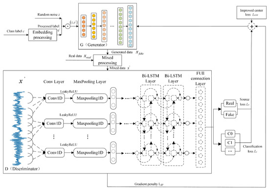 Then, the gradient penalty is added to the discriminator loss function of the original ACGAN model. The source loss function and classification loss function of the discriminator are shown in Equation (5) and Equation (6), respectively.