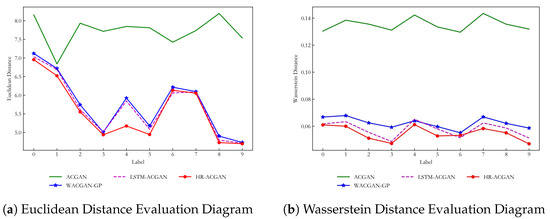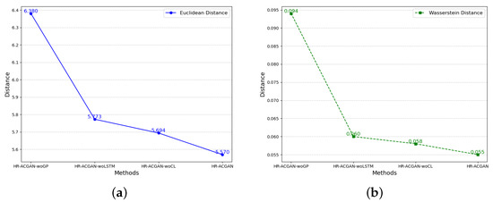 As shown in Figure 4, the data generated using the method proposed in this paper is of the best quality, and the penalty term, central loss term, and long short-term memory network (LSTM) set in the model all contribute to the improvement of the model performance. This is specifically reflected in two metrics for measuring the differences between the generated data and the real data, namely the Euclidean distance and the Wasserstein distance.