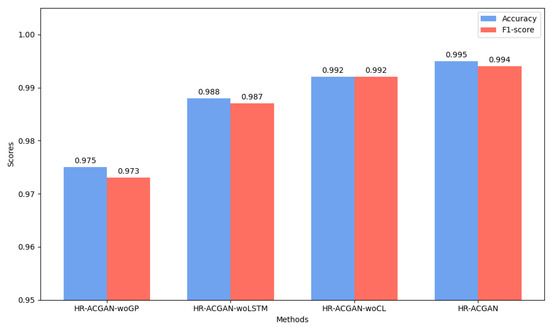 To verify the effectiveness of the key modules of HR-ACGAN, this paper designs three variants of HR-ACGAN, which are referred to as HR-ACGAN-woGP, HR-ACGAN-woLSTM, and HR-ACGAN-woCL, respectively. The descriptions of the four models, including HR-ACGAN, are shown as follows: