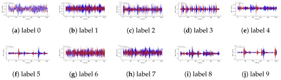 Waveform Comparison Diagram Between Generated Data and Real Data for Labels 0 to 9 Based on the Basic Dataset.