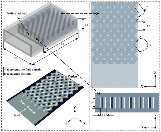 The diamond-shaped bifurcated inner-tube micro combustor is depicted in Figure 1 and constructed using ANSYS Design Modeler. Table 1 lists the dimensions of all the test cases (note that the thickness of external walls is 0.5 mm). The potential of the new configuration lies in two key design points. The first is the middle-perforated wall, which acts as the holder of the high-temperature flame near the micro combustor inlet. This greatly elongates the dwell time of the high-thermal energy and consequently improves the heat absorption rate by the outer wall. The second is the diamond-shaped bifurcated inner tubes, in which each flame path branches into two paths and then merges again in a repeatedly equidistant manner. This structure has an effective means of evenly distributing heat to the external walls to enhance the uniformity of the mean wall temperature. The combustor is composed of steel material.