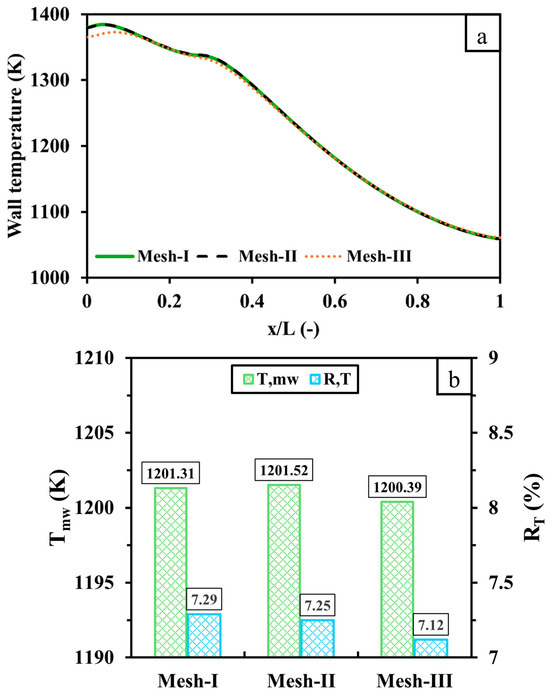 Figure 2 compares the three mesh resolutions outlined above with respect to the temperature distribution over the outer wall with respect to the dimensionless length , , and . As shown in Figure 2a, the wall temperature variation of Mesh-I is identical to that of Mesh-II. However, the lower-resolution mesh (Mesh-III) under-predicts the wall temperature in the inlet region as opposed to the higher-resolution cases. Figure 2b illustrates that and are highly consistent across all cases as the discrepancies of and between Mesh-III (Mesh-II) and Mesh-I are 0.92 K (0.21) and 0.17% (0.04%), respectively. Based on this mesh independence analysis, Mesh-II (cell number: 844,545) provides an optimal balance of accuracy and computational efficiency and is thus selected for all subsequent simulations.