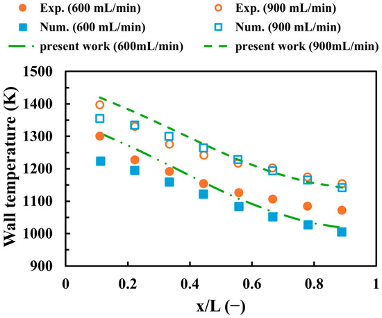 The validation process is an important step for all CFD works to demonstrate the soundness and precision of numerical settings. Thus, Figure 3 displays the validation of the present work against experimental [54] and numerical [55] results with respect to the centerline wall temperature at hydrogen discharge of 600 and 900 mL/min. To ensure an accurate validation process, the length, width, and height of the micro combustor used in the validation are 18 mm, 9 mm, and 3 mm, respectively, including a wall thickness of 0.5 mm, which is the same as the outlined experimental and numerical works. As observed in Figure 3, the variations of the predicted wall temperature of the present work are consistent with both experimental and simulated results, as they show constantly decreasing trends when approaching the outlet. The maximum percentage of errors between the current study and experimental (numerical) data occurs at a 600 mL/min discharge of hydrogen, with a discrepancy of 5.1% (7.03%) in the outlet (inlet) region. The causes of the outlined errors could be attributed to operational or measurement uncertainties for experiments and different mesh resolutions for simulations. In general, these levels of discrepancies are acceptable and, therefore, indicate that the numerical settings and modeling approaches are feasible and viable.