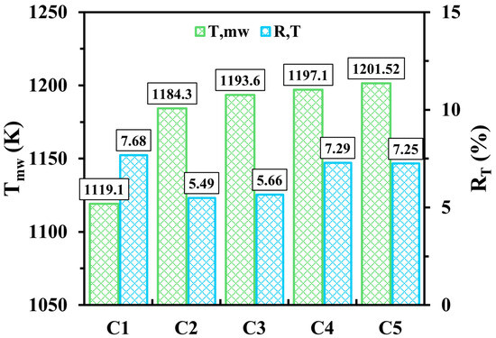 The discrepancies of pressure loss, exhaust gas temperature (), and exergy and radiation efficiencies are illustrated in Figure 8. As seen in Figure 8a, the novel design (C2, C3, C4, and C5) experiences a considerable increase in pressure loss as opposed to the conventional one (C1) for a micro-scale application because the perforated wall forms a barrier to the flame, forcing it to flow through smaller volumetric spaces, namely the inner flame channels. This implies that establishing a diamond-shaped structure requires more pumping power. Elongating the length of the proposed configuration progressively reduces the pressure drop, while widening such a structure leads to a notable further reduction. As discussed earlier, the newly proposed design results in an improvement of , indicating that more thermal energy is absorbed by walls. Thus, Figure 8a demonstrates that the exhaust gas temperature, which represents the waste thermal energy, is significantly low for the cases with the proposed design, as the differences of between C2, C3, C4, C5, and C1 are 489.88, 548.08, 581.17, and 585.98 K, respectively. Hence, the micro combustor embedded in the diamond-shaped bifurcated inner-tube structure reveals improvements in both exergy and radiation efficiencies, as illustrated in Figure 8b.