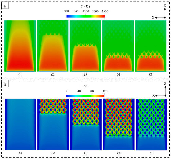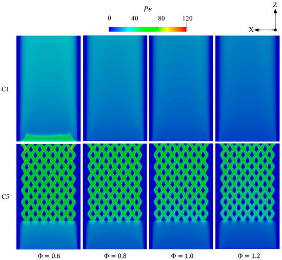 Figure 5 displays the temperature and Peclet (Pe) number, which is defined as the ratio of advection to diffusion effects [56,57], with respect to the different micro combustor design configurations. As seen in Figure 5a, the high-temperature flame of the conventional micro combustor (C1) narrows when approaching the outlet. In addition, the residence time of the flow of C1 is short due to the absence of the perforated wall. However, employing such a wall holds a high-temperature flame, while the diamond-shaped bifurcated inner-tube structure elongates the dwell time of heat in the micro combustor. For this, the capacity to transfer more thermal energy to the outer walls is improved, resulting in a significant increase in in C2, C3, C4, and C5 in comparison to C1, as illustrated in Figure 4. The length of the novel inner structure design also plays a major role in enhancing the process of heat transfer, as Figure 5a demonstrates that the shortest length (C2), compared to the medium (C3) and long (C4) lengths, allows a large amount of high-temperature flame to propagate for a larger volumetric space, leading to lower thermal energy retention. This significantly improves the uniformity of wall temperature , whereas the mean wall temperature is relatively lower as the length transitions from short to long (see Figure 4). The cross-sectional plane selected to present the temperature distribution in Figure 5 demonstrates that the temperature similarly varies throughout the domain for the wider (C5) and narrower (C4) flame channels.