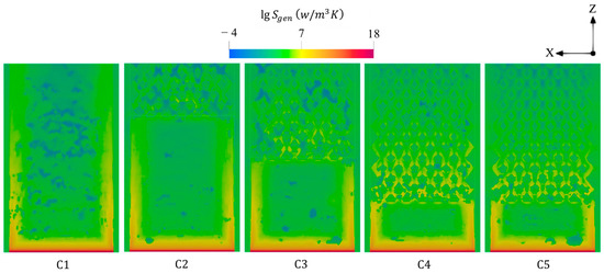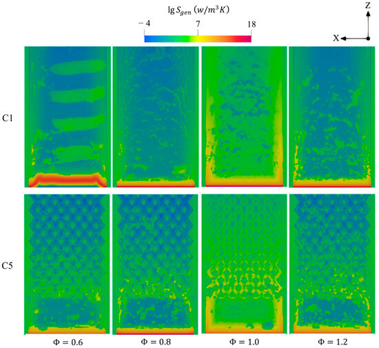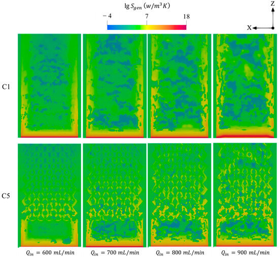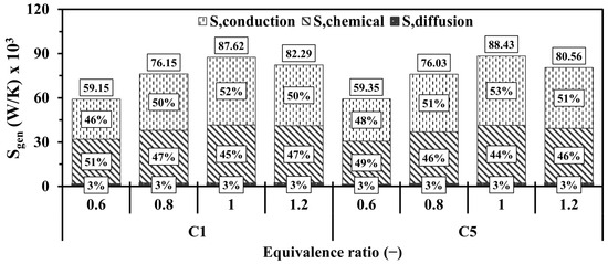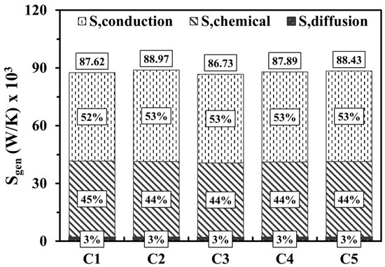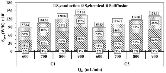Figure 13 shows the total entropy generation and the contributions of each mechanism in the entropy magnitude under different . As observed in Figure 13, elevating in both configurations is conducive to significantly promoting the entropy production by chemistry as of 600, 700, 800, and 900 mL/min in C1 (C5) advances the participation of the chemical effects in the entropy magnitudes by 45%, 52%, 58%, and 65% (44%, 51%, 57% and 62%), respectively. The causes of the gradual increase lie in that a greater amount of energy is introduced into the system at greater , thus resulting in a more vigorous chemistry and, hence, more intense combustion [11,29]. Furthermore, the increasingly prominent contribution of the chemistry mechanism progressively lowers the contribution of conduction, whereas the diffusion mechanism accounts for 3% of the total entropy generation with increasing , which could be attributed to the utilization of more fuel with high diffusion coefficients like hydrogen. The highlighted observations lead the total entropy generation to increase at higher .