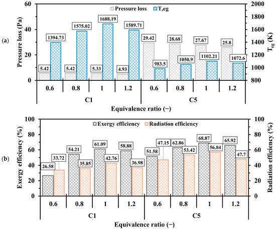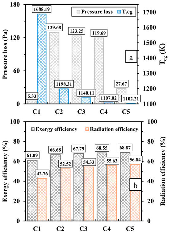 Variations of (a) pressure loss and exhaust gas temperature () and (b) exergy and radiation efficiencies for different design configurations.