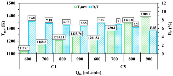 The effects of the variation of inlet velocity on and are illustrated in Figure 9. As can be seen, increasing the inlet velocity significantly enhances in both configurations, indicating that the outer wall greatly absorbs more thermal energy. This increasing trend is attributed to the system receiving more fuel at higher inlet velocities. Furthermore, constantly reduces when approaches 900 mL/min for all test cases, implying a notable improvement in the uniformity of the temperature over micro combustor walls. This improvement suggests that the injection of more hydrogen into the system results in optimal expansion of the hydrogen flame. Since C5 improves and in the previous sub-section compared to C1, the level of improvements in the highlighted parameters becomes more pronounced with increasing .
