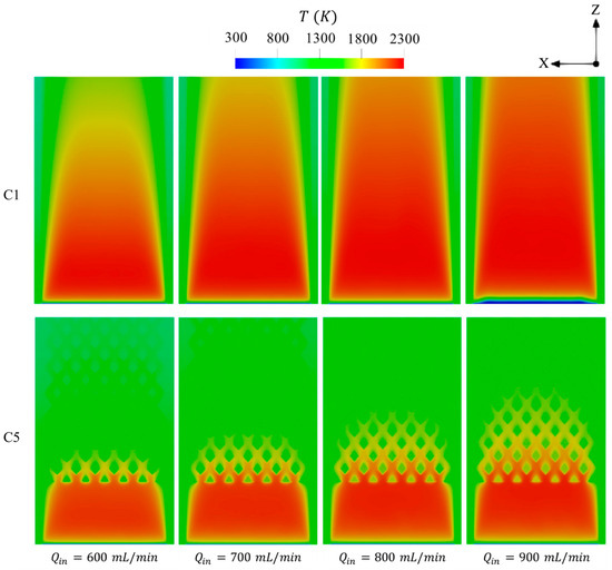 The effects of inlet velocity on the distributions of temperature are displayed in Figure 10. As observed in Figure 10, elevating leads the area covered by the high temperature to widely distribute across the domain, signifying that introducing more high-flame-speed fuel like hydrogen into the micro combustor enhances the flame to freely propagate over a longer volume. This confirms the improvement in the uniformity of the wall temperature at high velocity, as can be observed in Figure 9. In contrast to C1, the bifurcated diamond-shaped structure in C5 retains a greater thermal energy at higher , leading to the transfer of more heat to the walls and, hence, enhancing both and as previously observed. In addition to this, holding the hot gases by such a structure also tends to serve as a preheating agent for the inlet flow as the onset of combustion in C5 at of 900 mL/min occurs in the same region as in the other cases with lower , whereas combustion in C1 takes place relatively farther downstream under the same condition.