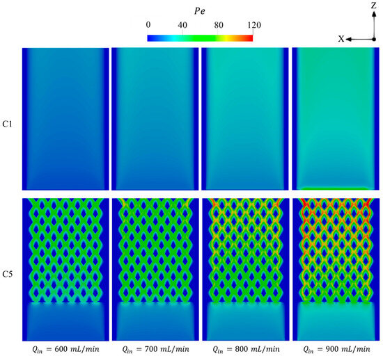Variations of Pe number in the C1 and C5 configurations under different levels of .