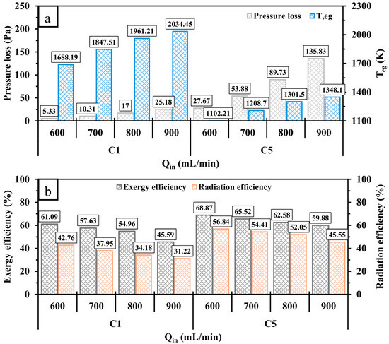 Figure 14 presents the variations in pressure loss, , exergy, and radiation efficiencies under different conditions. As depicted in Figure 14a, an increase in in all test cases leads to a gradual rise in pressure loss, indicating the need for more input power in such cases. As approaches 900 mL/min, the relative increase in pressure loss in C5 is higher than in C1, which is caused by the higher rate of collision between the high-velocity flame and the perforated wall. In addition, cases with high velocities exhibit a greater waste of thermal energy as increases with an increase in , particularly in C1, which indicates significantly less heat transfer to the outer walls in comparison with C5. For both configurations, the higher waster of thermal energy progressively reduces the exergy and radiation efficiencies, as shown in Figure 14b. It is worth noting that the conventional design (C1) exhibits considerable reductions in the efficiencies compared to C5 due to the greater . Feeding the system with a higher amount of hydrogen at a higher considerably improves both and ; however, the variations in the outlined efficiencies imply that the micro combustor appears to have constraints in its capacity to accommodate a substantial amount of energy.