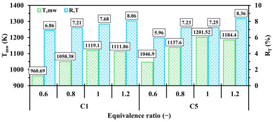 Figure 15 compares and at various ranging from 0.6 to 1.2. For both configurations, the pattern fluctuates as it significantly increases from the fuel-lean to stoichiometric conditions ( = 0.6 to 1) and then decreases when approaching the fuel-rich condition ( = 1.2). This highlights that the cases of exhibit an effective means of reducing due to the low quantity of hydrogen supplied to the system leading to less thermal energy release during combustion, whereas the cases of suffers from the low availability of oxygen, resulting in a lower consumption rate of fuel compared to the stoichiometric condition. This pronounces that the unity optimizes the mean wall temperature parameter. As shown in Figure 15, consistently increases from low to high , indicating that higher values lead to a more uneven temperature distribution along the micro combustion walls.