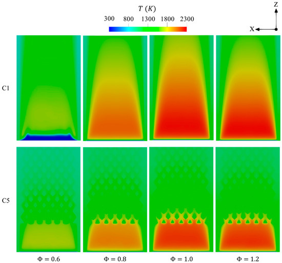 Figure 16 illustrates the effects of varying from 0.6 to 1.2 on the distribution of temperature over the cross-sectional plane of the micro combustor. = 1 optimally balances hydrogen and oxidizer in all test cases, resulting in the maximum temperature, as shown in Figure 16. However, the cases display a remarkably low temperature due to the ignition of a low amount of energy during combustion, whereas the case reduces the maximum temperature as opposed to that of stoichiometric condition because it suffers from a low chemistry rate as the system is fed with insufficient oxygen. In contrast to C5, the C1 configuration at of 0.6 exhibits a farther initiation of combustion from the inlet, which could indicate combustion failure at leaner conditions. However, the preheating factor resulting from heat retention by the proposed inner structure in C5 leads the combustion to occur in the same area as richer conditions . This likely suggests that the flammability limit becomes wider with the new design.