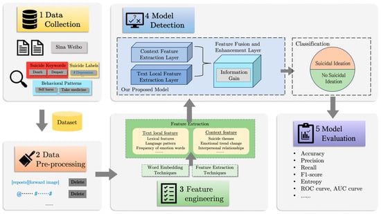 This study introduces a five-stage framework for text classification, using machine learning techniques to meticulously analyze the content of a user’s microblogs. The framework is depicted in Figure 1 and will be detailed in the following sections. Our model, tailored for deployment on Weibo, is adept at detecting suicidal ideation by classifying relevant text and informing the execution of pertinent intervention strategies.