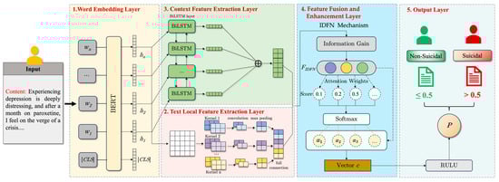 - Output Layer: Fully connected layers further refine the global features. A final layer with an activation function is employed to produce the model’s output, namely, the probability of suicidal ideation classification, which informs the classification decision.