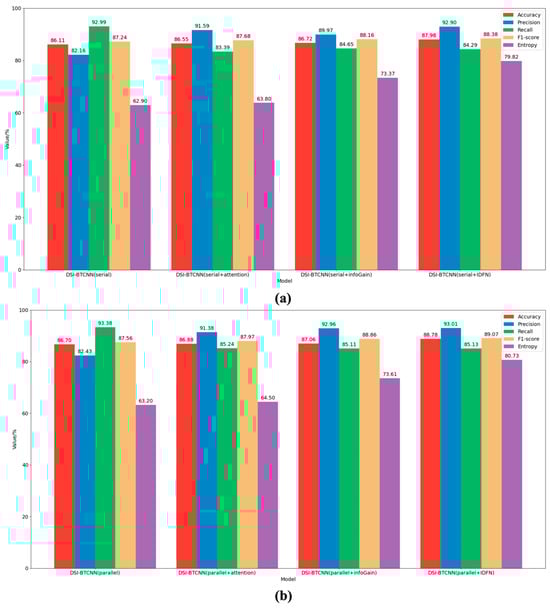 Firstly, diverging from conventional feature fusion approaches [,], our IDFN strategy embodies a theoretical framework for optimal feature selection that fortifies the feature selection process within a dual-channel architecture. For instance, one channel may concentrate on lexical features, such as the occurrence of specific keywords, while the other channel assesses the sentiment or emotional tone of the text. The IDFN strategy harmonizes these varied features, employing information gain to assign appropriate weights and leveraging the attention mechanism to focus on the most informative elements. This approach leads to a more precise detection of suicidal ideation. The combination of dual-channel processing and information gain-based weight allocation introduces innovative perspectives and methodologies for deep learning in the domain of text processing.