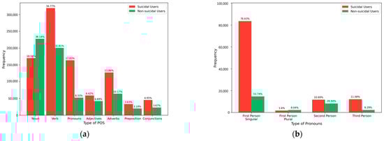 First, linguistic features play a guiding role in model improvement. As shown in Figure 6, the POS usage habits of different groups of people vary. Linguistic features are reflections of users’ inner states. In particular, the use of first-person verbs, nouns, and singular pronouns is considered to be related to suicidal ideation, which is consistent with previous research []. Moreover, as can be seen from the cases in Table 6, our model demonstrates excellent recognition efficiency in an environment rich in verbs, nouns, and pronouns. Therefore, in suicide-related discourse, it is necessary to further explore fine-grained language features, including examining different grammatical situations of pronouns according to reference []. Understanding the psychological impacts associated with these cases can provide deeper insights into the cognitive and emotional processes related to suicidal ideation.