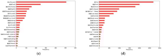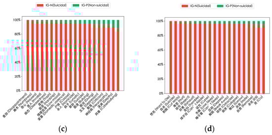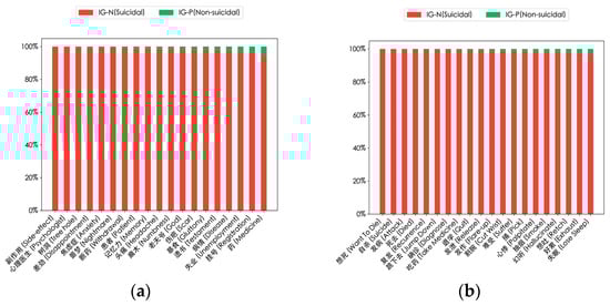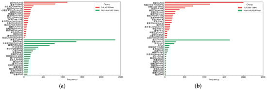 Third, the usage frequency, combinations, and information gain of specific words can effectively distinguish between users with and without suicidal tendencies. As shown in Figure 8, in the texts of users with suicidal tendencies, words related to negative emotions and mental states such as “Suicide”, “Cut wrists”, and “Numbness” are used significantly more frequently than in those of non-suicidal users. Moreover, the information gain values of these words in the suicidal context are much higher than in the non-suicidal context, indicating their crucial role in differentiating between the two types of users, which is consistent with the conclusion of previous research []. Meanwhile, users with suicidal tendencies have a relatively high frequency of using words related to medical and mental health, such as “Psychologist”, “Side-effect”, and “Anxiety”, suggesting that they may be facing psychological or mental health problems and thus have a relatively high suicide risk. This finding is in line with that of []. However, these studies did not consider that their information gain can be used to identify suicidal ideation. In the future, it may be necessary to conduct focused research on some professional psychiatric medications.