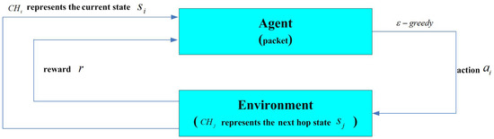 - After executing the action , the agent (packet) transitions to a new state, (represented as ), and receives an observed reward, . The reward value iswhere is the residual energy of , k represents the number of neighbor CHs, is the distance between and , and is the distance between and .