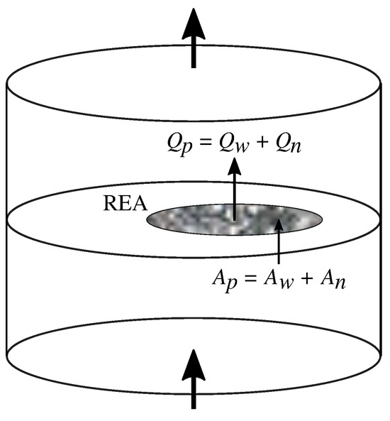We define a plane that cuts through the cylindrical pore sample orthogonally to the average flow direction. We define Representative Elementary Area (REA) within the plane. There is a wetting fluid flow rate and a non-wetting fluid flow rate passing through the REA. The total flow rate is . The wetting fluid covers an area of the REA and the non-wetting fluid an area . The total pore area of the REA is .