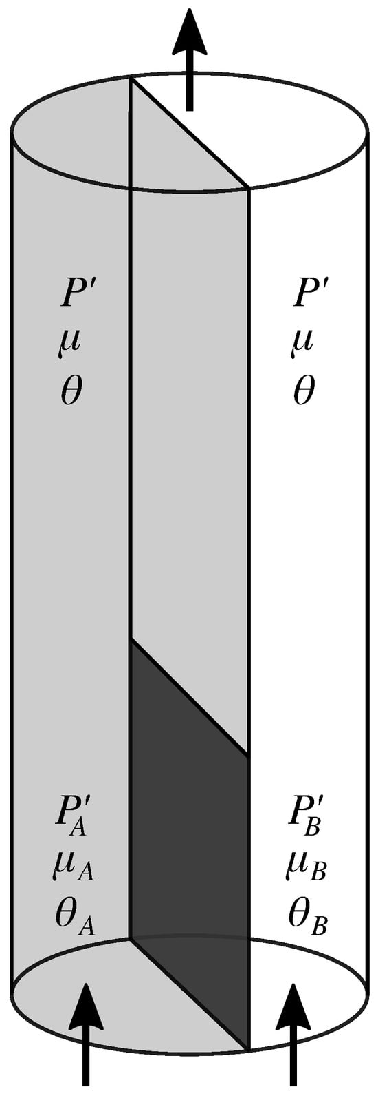 We follow Hansen et al. [9], and consider a cylindrical porous medium (see Figure 2). We imagine a plane running through the cylinder axis parallel to the average flow direction. On one side of the plane, the porous medium has one set of properties; on the other side of the plane, it has another set of properties. The difference may be in chemical composition of the matrix, or it may consist of different porosity or topological structure. We name the two halves “A” and “B”, respectively. We assume the two halves to be statistically homogeneous along the axis.
