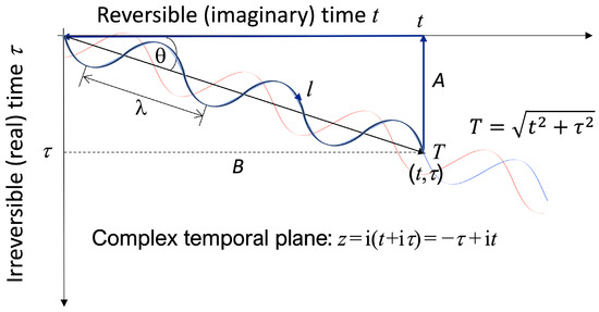 The key canonical relationships (of the Euler-Lagrange variational equation involving Hamiltonian and Lagrangian quantities) are defined using QGT in hyperbolic spacetime, as discussed above and as appropriate for an analysis based on the Shannon information. The Euclidean complex temporal plane is given by z = i(t + iτ) (see Equation (3) of [3]) as indicated in Figure 2. The associated hyperbolic complex time is then given by qn/Z = ln(n/Z): n ∈ {t,τ} (see Equation (7a) above) where in this context Z is the holographic temporal scaling factor (akin to a ‘temporal radius’) of the system (the equivalent holographic spatial radius R is discussed above, see Equation (5a,b); and q′ is the derivative of hyperbolic time with respect to T, given by q′n ≡ ∂qn/∂T: n ∈ {t,τ} (see Equation (7b): combined with the entropic mass mS, these are effectively the entropic momenta). Finally, the quantity Λ in Equation (8) is the parameter that determines the strength of entropic purpose: Λ = 0 for a system with zero entropic purpose.