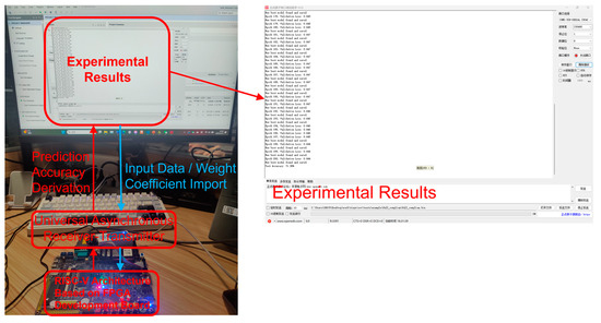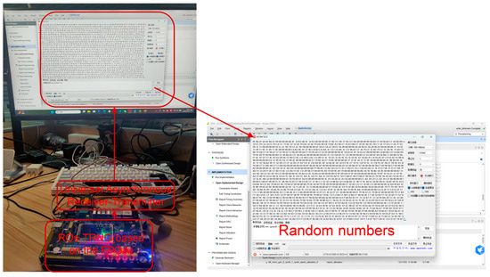 This paper implements the proposed algorithm on an edge device, with the experimental platform built on a RISC-V microprocessor system based on the Zynq-7020 development board. The hardware resource consumption is summarized in Table 9. The network model parameters and computation methods are compiled using C language and loaded onto the RISC-V processor, enabling online training and forward inference evaluation of random numbers. The experimental process is illustrated in Figure 8, where data are imported into the development board via the UART serial port. The board performs on-chip weight updates for both the training and test datasets. Finally, the training results are transmitted back to the PC via UART for prediction accuracy observation. This paper presents prediction experiments for the LC-RNG and ROs-RNG under two different randomness conditions. The experimental results are shown in Table 10. Although the on-chip training time is relatively long, approximately 30 min, the prediction accuracy is consistent with the PC-based results. This result preliminarily validates the feasibility of implementing the algorithm on edge devices. Future research will focus on optimizing the neural network model and incorporating hardware accelerators to enhance computational efficiency.