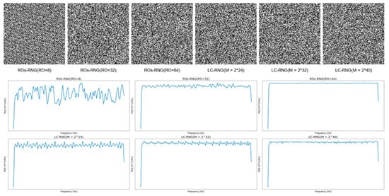 As shown in Figure 3, FPGA is used to implement random numbers with different ring counts, specifically using the Zynq-7020 platform. The oscillator ring is constructed using five-stage inverters, with an oscillation frequency of approximately . Sampling is performed using a clock signal, and the outputs are combined through multi-way XOR to produce a single output. To simulate the variation in the quality of random numbers in practical applications of multi-ring oscillators, the number of oscillation rings is set to . For a fixed ring count of 32, different sampling frequencies are set.