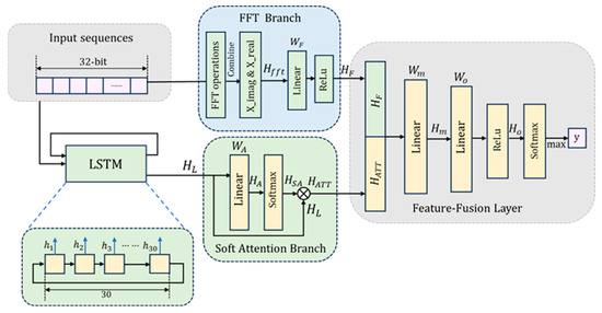 The input random number sequence is first divided into 32-bit blocks, denoted as . The time-domain branch processes these sequences through 30 LSTM units, with each unit outputting a hidden state at each corresponding time step. These hidden states are subsequently fed into the soft attention mechanism.