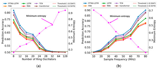 Comparison of Prediction Performance and Minimum Entropy Values for Different Neural Network Models under Varying Conditions of Random Sequences: (a) Evaluation Results for Random Numbers Based on Different Ring Counts (8–128); (b) Evaluation Results for Random Numbers Based on Different Sampling Frequencies (10–80 MHz).