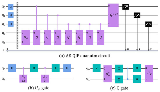 (a) The quantum circuit representing the AE-QIP algorithm constructed using the Qiskit framework, (b) the quantum circuit design for the gate, and (c) the quantum circuit configuration for the Q gate.