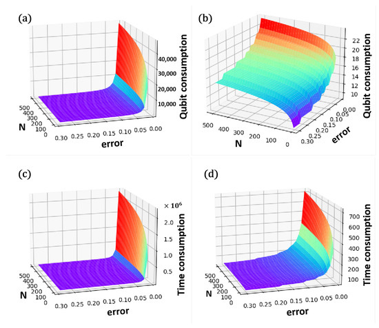 Figure 4c,d elucidate the relationship between the time complexities of both methodologies, revealing that complexity increases with both the dimensionality of the vector N and the algorithm accuracy, represented as . Notably, when the error term remains below a particular threshold (), the AE-QIP algorithm demonstrates a lower time complexity compared to the ST-QIP algorithm. Conversely, should the error exceed an excessive limit, the algorithm loses its practical applicability. Thus, the AE-QIP algorithm’s time complexity is significantly reduced in comparison to that of the ST-QIP algorithm when the error resides within an acceptable range, such as .