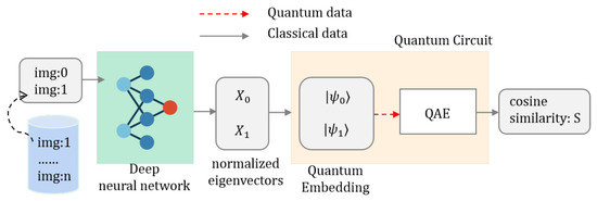 The primary objective of image retrieval involves comparing the feature vector of a query image with the feature vector of images in the database and measuring the similarity between them using cosine distance. This process aims to identify images whose cosine similarity S exceeds a defined threshold . In this subsection, we illustrate the application of the AE-QIP algorithm for image retrieval and provide a schematic representation of the image retrieval system’s functioning. As depicted in Figure 5, the system comprises two main components: the classical feature vector extraction stage and the quantum state evolution stage, which together form a hybrid quantum-classical algorithm architecture.