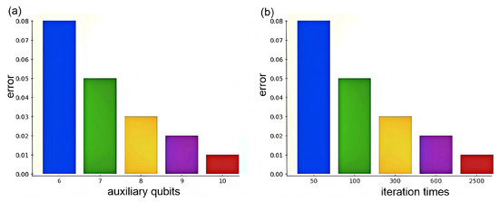 In Figure 4a, it is evident that the qubit consumption of the ST-QIP algorithm rises as the error decreases. This trend becomes particularly pronounced when , where we observe a sharp increase in qubit consumption with diminishing error. In this experiment, we set the dimension of the feature vector to . To achieve a minimum accuracy of 95%, the error must be below 0.05, resulting in a qubit consumption of at least 700 for the ST-QIP algorithm. In contrast, the AE-QIP algorithm requires only a single measurement of the auxiliary qubits to compute the inner product. As illustrated in Figure 4b, the number of auxiliary qubits increases as the error decreases. In this experiment, four qubits are needed to encode the quantum state. According to Equation (14), when , at least seven auxiliary qubits are necessary, leading to a total qubit consumption of just 11.