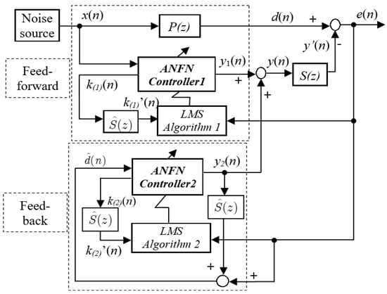 In recent years, some efforts have been made to develop advanced ANC systems with the FxLMS algorithm [,,] to promote the real-world application of ANC systems, e.g., the bilinear FxLMS algorithm [,,], Volterra FxLMS algorithm [], radial basis function networks [], fuzzy systems [,], recurrent neural networks [], and other neural networks [], etc. Specifically, some researchers have focused on proposing new mechanisms to adapt nonlinear systems and accelerate the convergence speed to improve the overall control performance. An adaptive neural fuzzy network [,,] was proposed by combining the fuzzy filter and the neural network as a nonlinear filter. The nonlinear mapping capability of the neural network, together with its exceptional learning ability and the excellent logical reasoning of the fuzzy system, has been proved as a promising solution for complex control systems. However, the HANC system with the neural network and fuzzy system has not been fully explored, since the stability of such HANC system is influenced by the coupling between the feedforward and feedback controls, which inspired the current study.