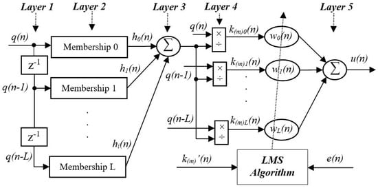 The specific ANFN controller and the LMS algorithm used to update the weights of the ANFN controller are shown in Figure 4, which can be described by the signal propagation through five layers. The solution for online updating network weights is determined using the FxLMS method, following a nonlinear adaptive mechanism. As shown in Figure 4, denoting as the component of layer g, the computation of each layer is given as follows: