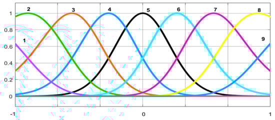 In this layer, a membership function with a Gaussian distribution [] as a fuzzy logic system is designed to handle the nonlinear component as follows: