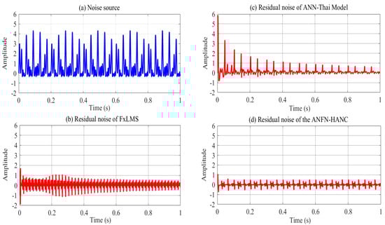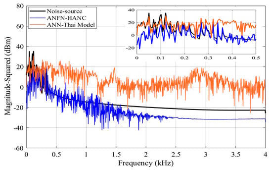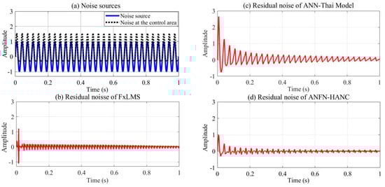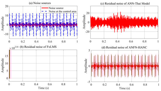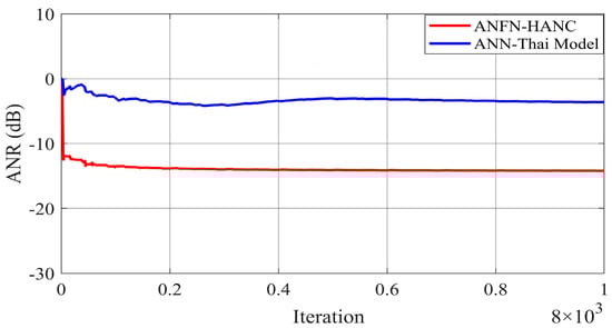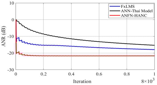 All other parameters of the ANC systems are selected as the same as Case 2. Comparative simulation results are shown in Figure 13, Figure 14 and Figure 15. Figure 13a presents the noise source and noise signal in the control area in the time domain, which indicates that the noise in the control area changes significantly compared to the original noise. The nonlinear dynamics will reduce the performance of the ANC systems. Figure 13b illustrates the control response of the traditional FIR-based FxLMS HANC system using the linear FIR filter in the time domain, which triggers instability as in [,]. Figure 13c,d display the residual noise signal of the ANN-Thai model-based system and the proposed ANFN-HANC system. These figures also show that the proposed ANFN-based controllers can retain stability and achieve a fairly small residual noise better than the ANN-Thai model-based ANC system. To be specific, from the quantitative error indices given in Table 3, it is found that, compared to the FIR-HANC, the control error performance of ANFN-HANC achieves a reduction of 86% in MAE, 96% in MSE, and 81% in SD. Figure 14 shows the spectrum signal of these three methods in the frequency domain. Since the FIR-based ANC system with the FxLMS method cannot retain stability due to the nonlinearities in the transmission path, its spectrum is not shown in Figure 14. These results also support the theoretical analysis given in Section 4. Figure 15 shows the ANR of the proposed ANFN HANC system with the red colored line and the ANR of the ANN-Thai model with the blue colored line. This figure also demonstrates that the proposed ANFN-HANC has a more reliable noise reduction capability.