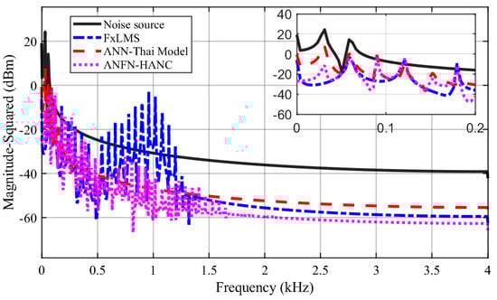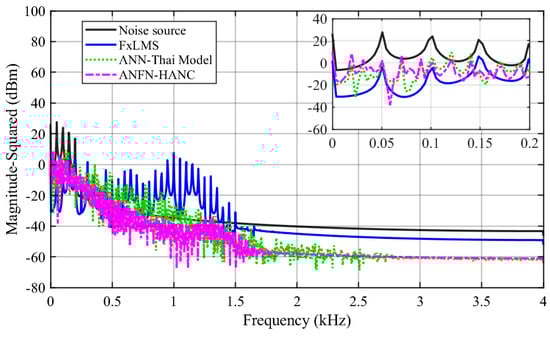 Figure 11 displays the spectrum of the signals of three ANC systems in the frequency domain, where the spectrum of the noise source is shown in the solid black line. The solid blue, dotted green, and dash–dot purple lines indicate the spectrum of the residual noise for the FIR-based FxLMS method, the ANN-Thai model-based method proposed in [], and the proposed ANFN-HANC method, respectively. From these figures, we can see that the linear FIR filter with FxLMS responds to reduce the residual noise in a specific frequency band, but for the frequency band outside the noise control range, it shows an increased trend, which may lead to instability of the FIR filter. This can be explained as follows: when adding two signals together, in addition to the center frequency signals with the largest amplitude, there are signals with a small amplitude other than the center frequency, and these frequencies (which can be considered as nonlinearity in the system) make the linear FIR filter unstable [,], which will also be shown in Case 3. It can also be observed from these figures that the performance of the proposed ANFN-HANC system is more effective than the traditional FIR-based FxLMS method and ANN-Thai model-based method.