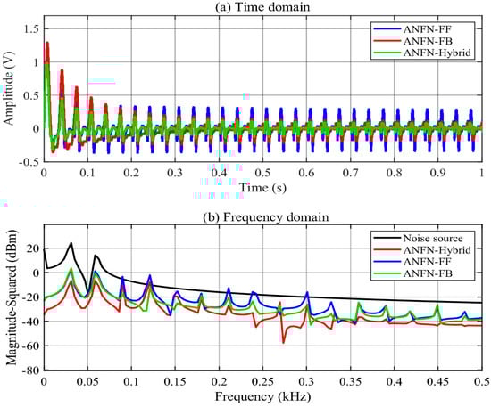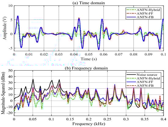 Finally, the use of a hybrid structure with both FF and FB controllers is validated. Figure 16a shows the residual noise of the proposed HANC systems with different control configurations in the time domain, i.e., the feedforward ANC, the feedback ANC, and the proposed ANFN-HANC, while Figure 16b presents the spectrum signal of the residual noise in the frequency domain. From these figures, we can see that the performance of the feedback model is slightly better than the feedforward model, which is similar to Case 1. Moreover, the proposed ANFN-HANC system with both feedback and feedforward controllers obtains the best performance.